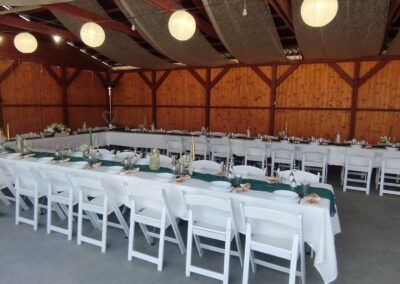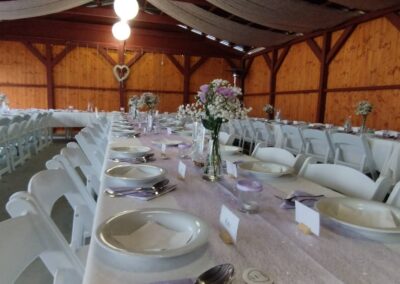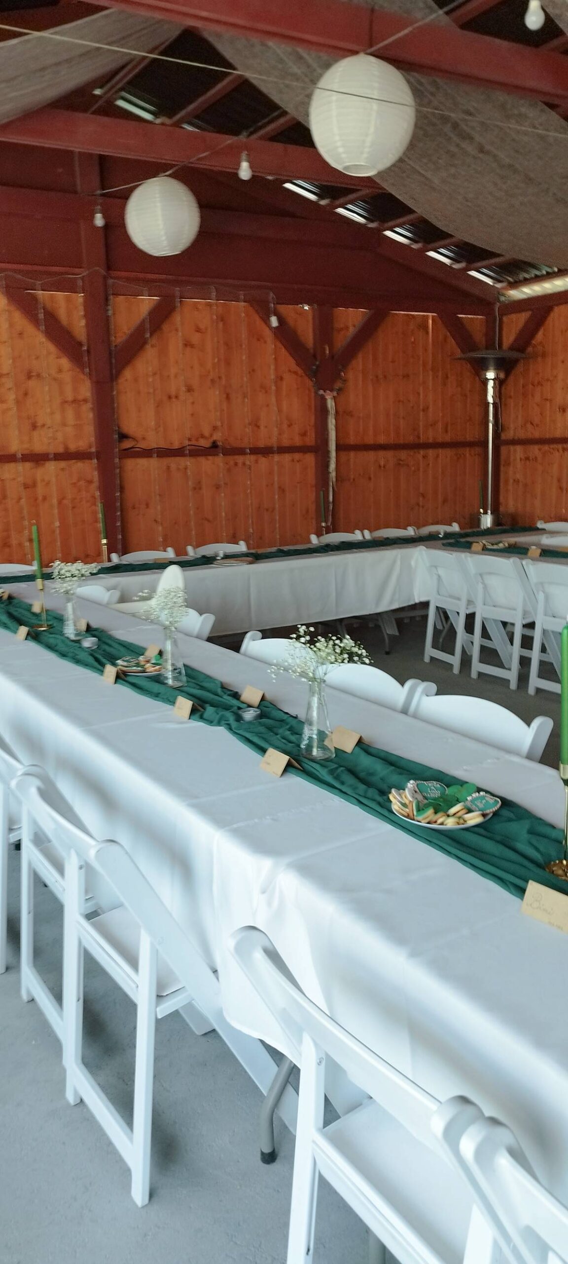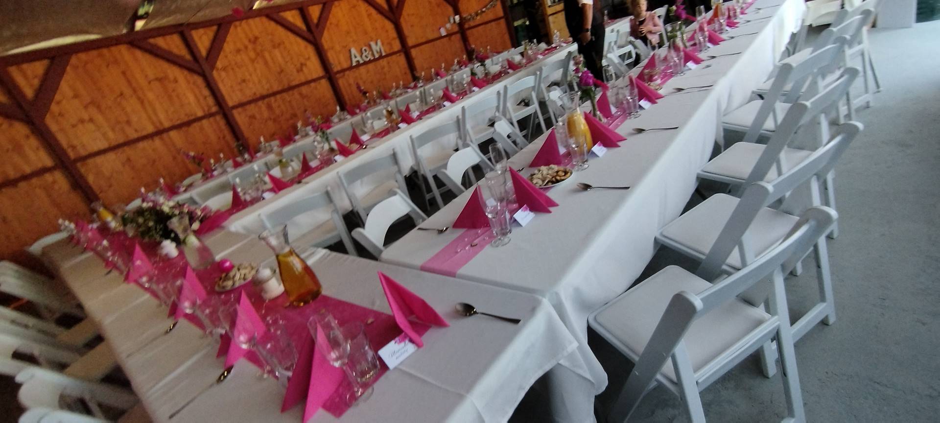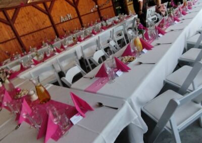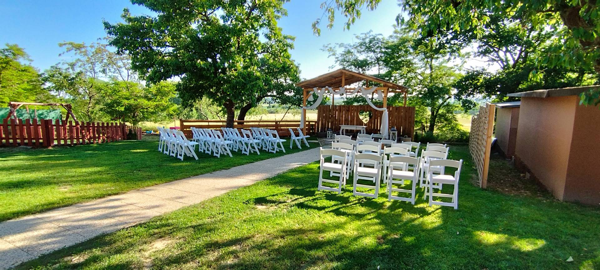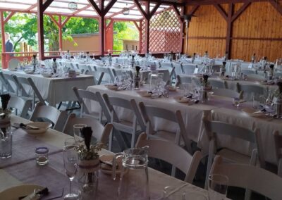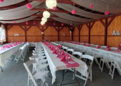 - Stoly a židle až pro 96 lidí sedících v altánu + 20 židlí u oddacího místa, 20 židlí s 5 stolečky na terase, 16 židlí s 5 stolečky u grilu, ubrusy 30ks, 3x koktejlový kulatý stůl s potahem.