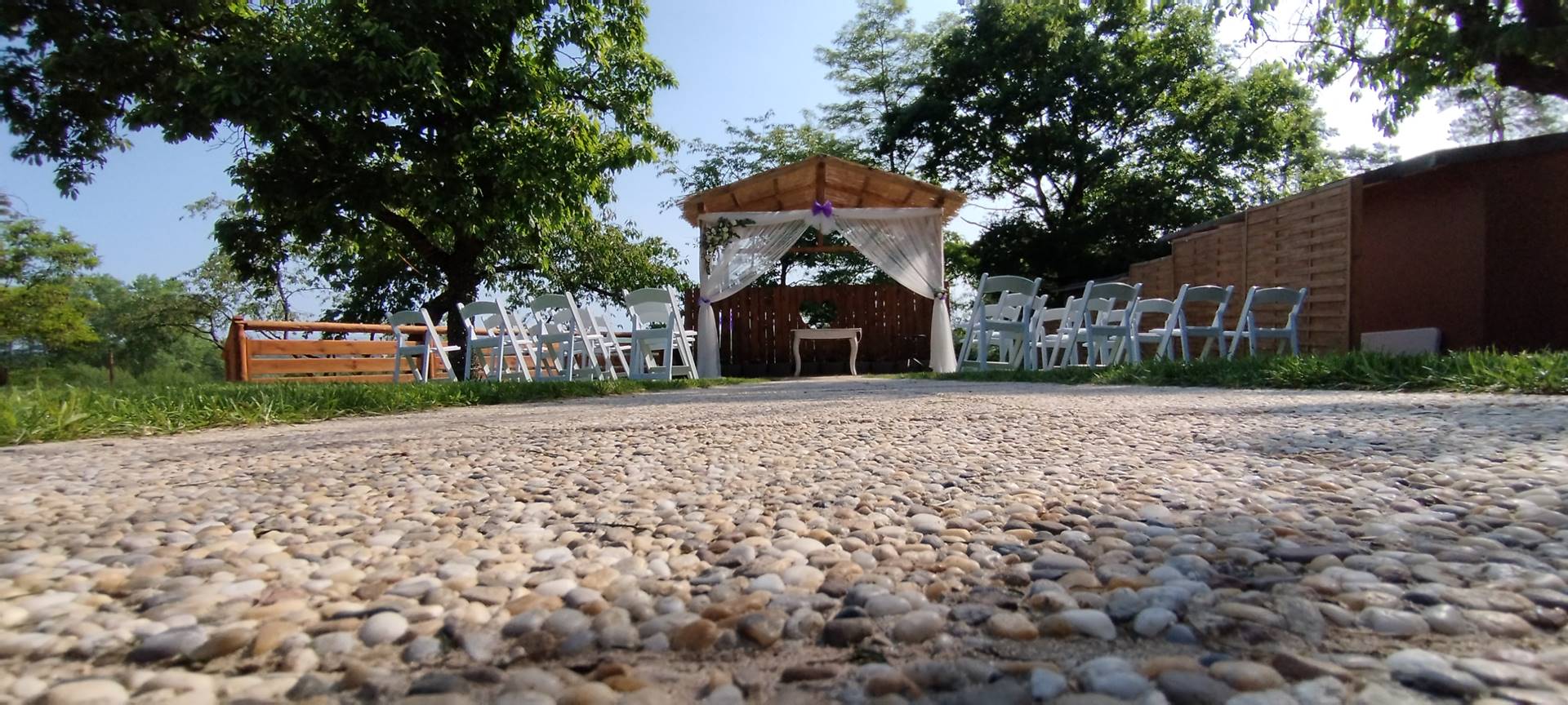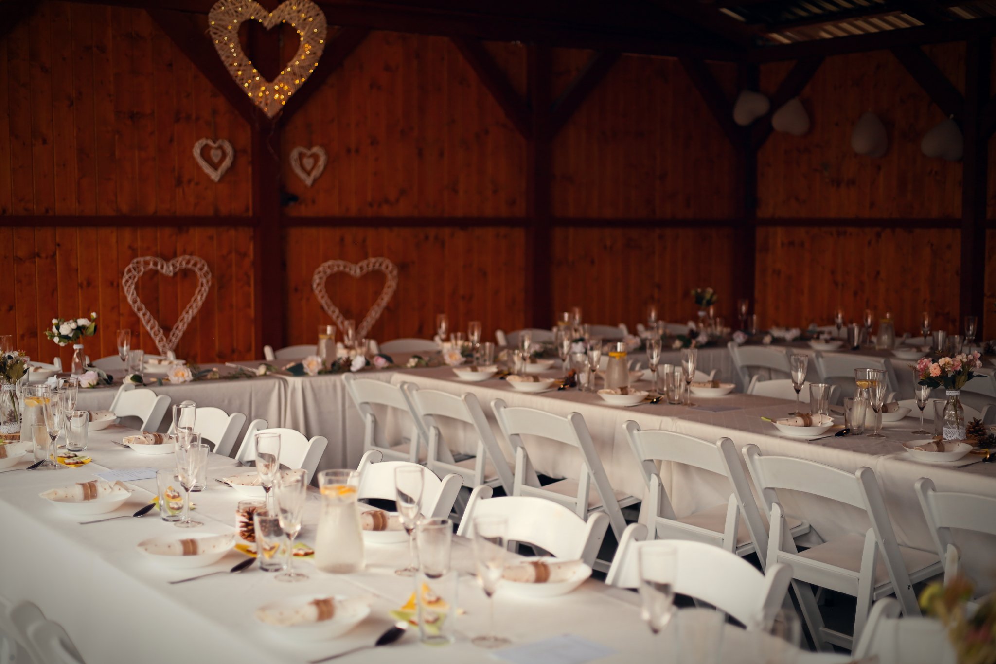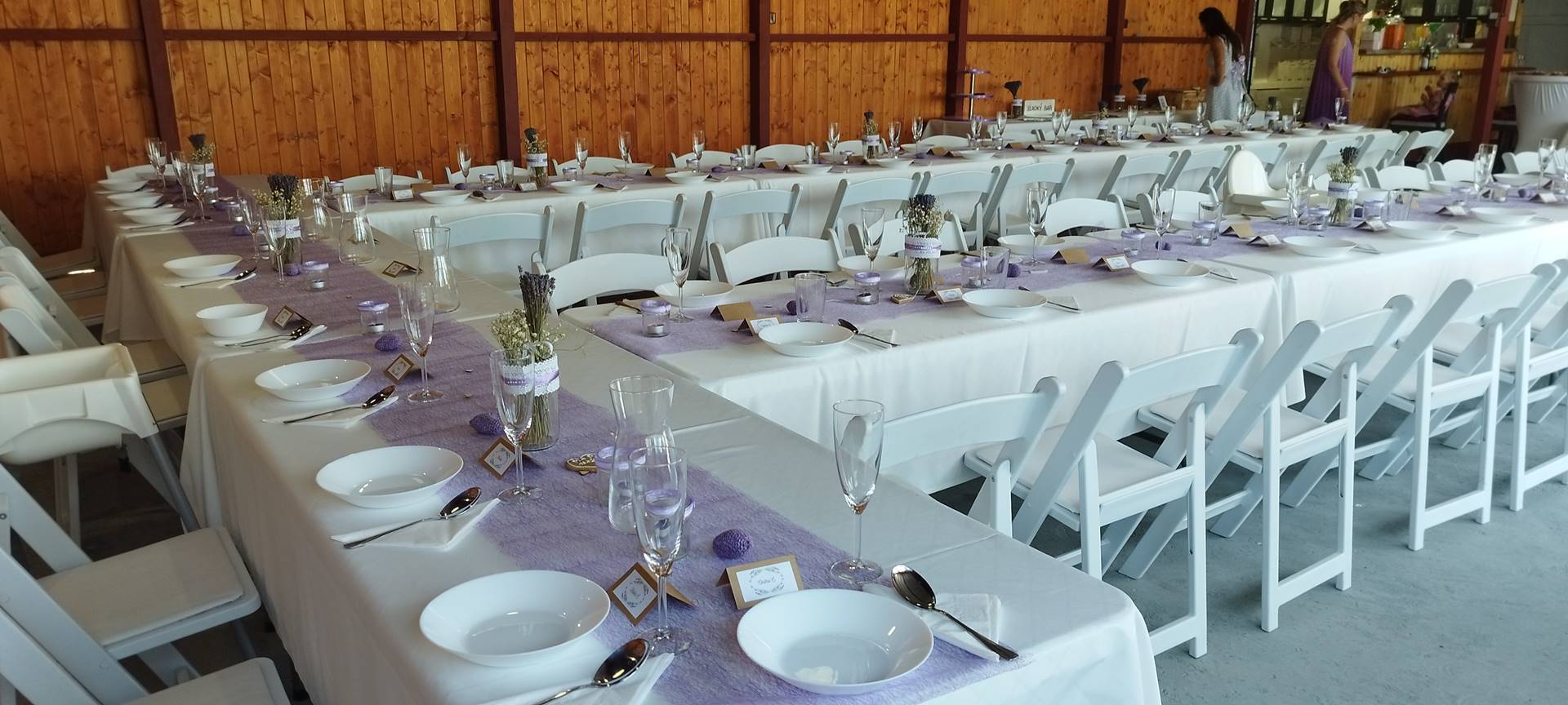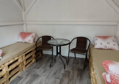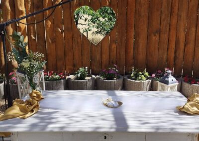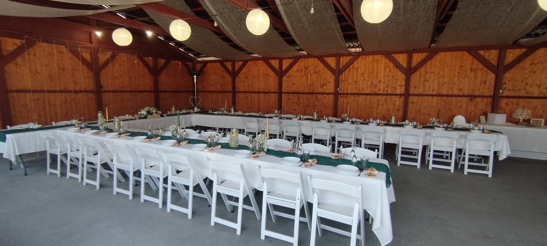 - Stoly a židle až pro 96 lidí sedících v altánu + 20 židlí u oddacího místa, 20 židlí s 5 stolečky na terase, 16 židlí s 5 stolečky u grilu, ubrusy 30ks, 3x koktejlový kulatý stůl s potahem.