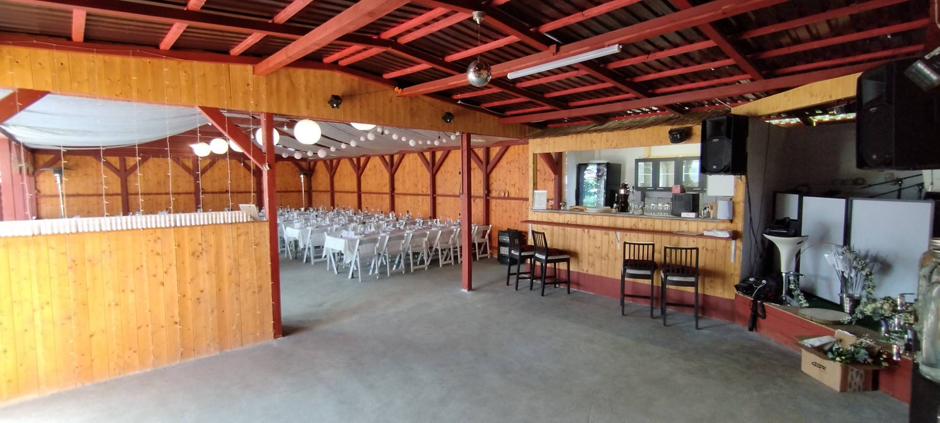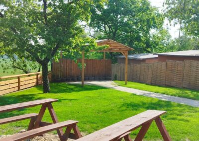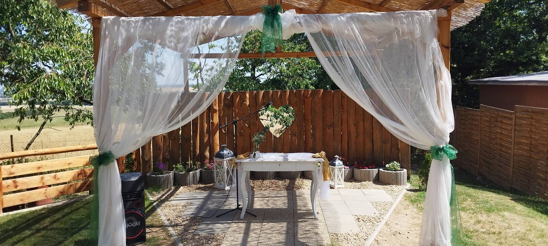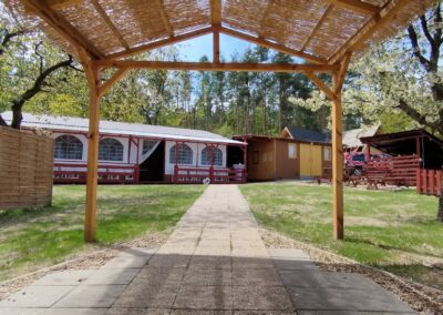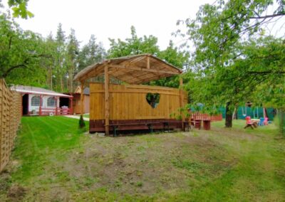 - Prostorná pergola – altán 8 m x12 m, bar, menší sklad, kuchyňka a místo pro tanec.