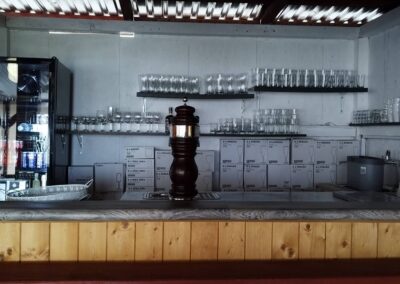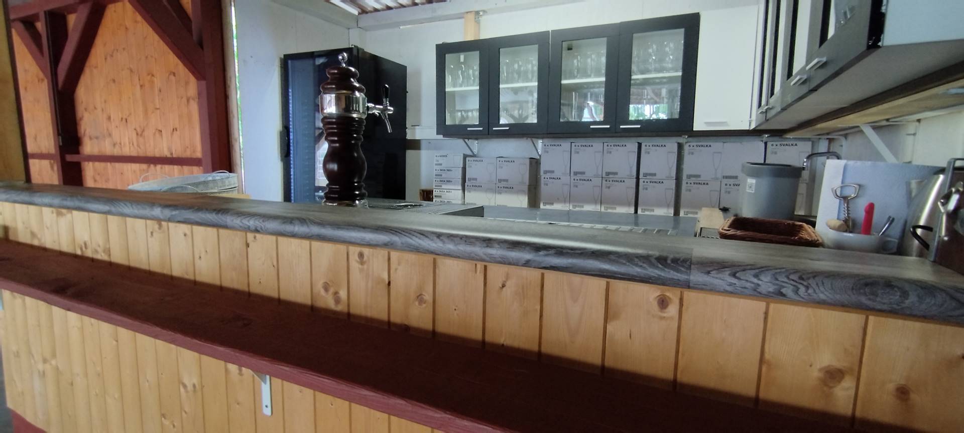 - Bar s profesionálním výčepním zařízením se dvěma pípami, přenosné chladící zařízení a kávovarem na zrnkovou kávu.